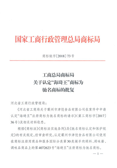 中国驰名商标证书1