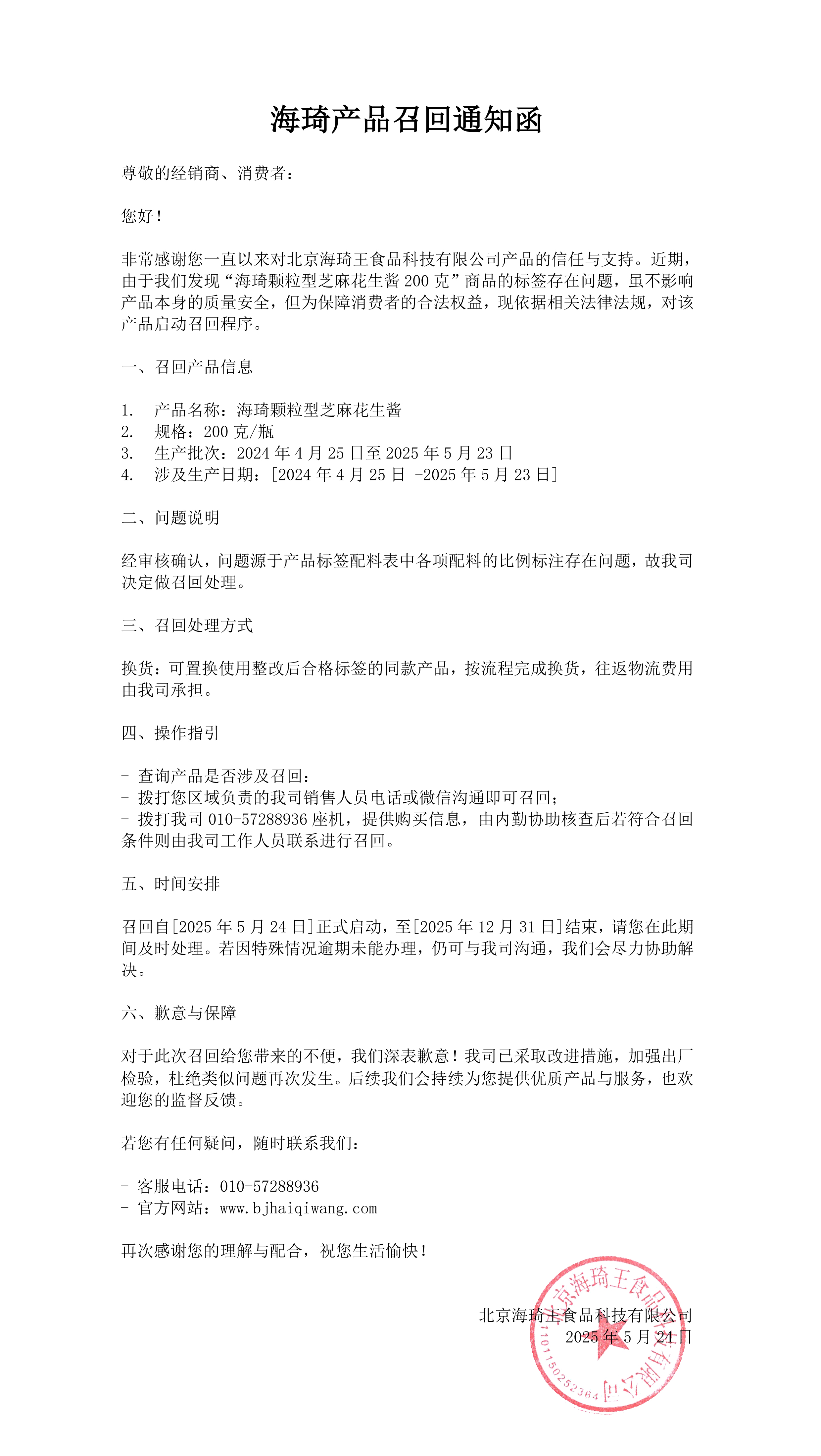 海琦产品召回通知函
